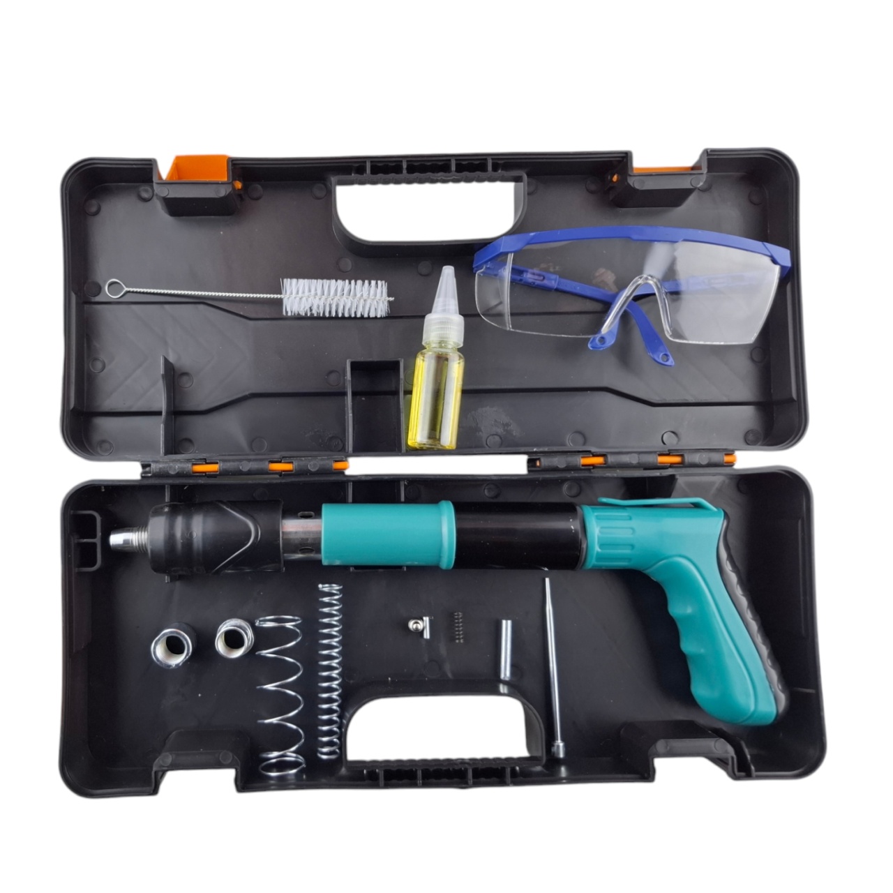 Монтажный пистолетпоставляется в удобном и прочном кейсе N2, в который входят все необходимые для работы аксессуары: щетка для чистки, защитные очки, смазка, сменные насадки и запасная пружина.