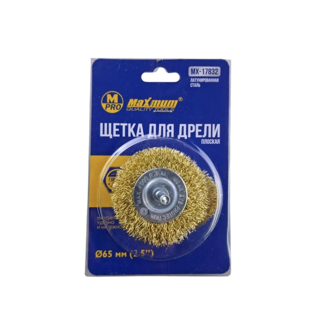 Щетка плоская с проволочной латунированной щетиной 65 мм от "MAXIMUM QUALITY TOOLS" крепится на дрель или шуруповерт через резьбовую шпильку 6 мм.